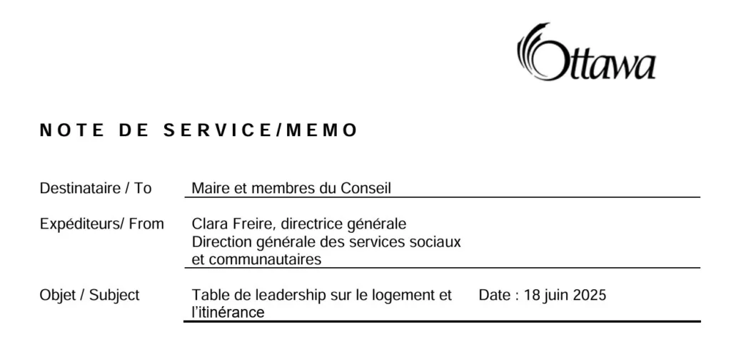 La présente note de service décrit l’objet et la portée de la Table de leadership sur le logement et l’itinérance (TLLI) récemment lancée. La TLLI fonctionne comme un groupe de travail chapeauté par la direction générale, c.-à-d. un organisme consultatif mis sur pied par la direction générale des Services sociaux et communautaires afin de recueillir de précieuses données qui aideront à soutenir les priorités stratégiques de la Ville. L’une des priorités stratégiques du Conseil municipal actuel est d’investir dans des services utiles à toute la population, notamment aux personnes les plus vulnérables, pour créer une ville avec des logements abordables qui est plus vivable pour tous. La TLLI collaborera avec d’autres groupes de travail dirigés par les directions générales, comme le nouveau Groupe de travail sur l’innovation en matière de logement, ainsi que d’autres initiatives dirigées par le secteur pour atteindre les objectifs du Plan stratégique de la Ville d’Ottawa 2023-2026 et le Plan décennal de logement et de lutte contre l’itinérance. La TLLI est composée de leaders du secteur du logement et de l’itinérance d’Ottawa ainsi que de membres du personnel de la Ville.